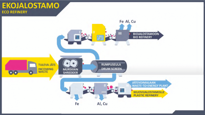 Kiertotalouskylä on pitkälle automatisoitu, uusimpaan teknologiaan perustuva kierrätyslaitos, joka hyödyntää kotitalouksien lajittelemattomatonta sekajätettä. Eri jätejakeet erotellaan ja muovi lajitellaan edelleen kolmeen eri muovilaatuun monivaiheisessa prosessissa. Uusiokäyttöön soveltuva muovi puhdistetaan ja jalostetaan uusioraaka-aineeksi. Yritys myy muovirouhetta yritysasiakkailleen ja valmistaa siitä omassa tuotannossaan kyllästettyä puuta korvaavia rakennuselementtejä.