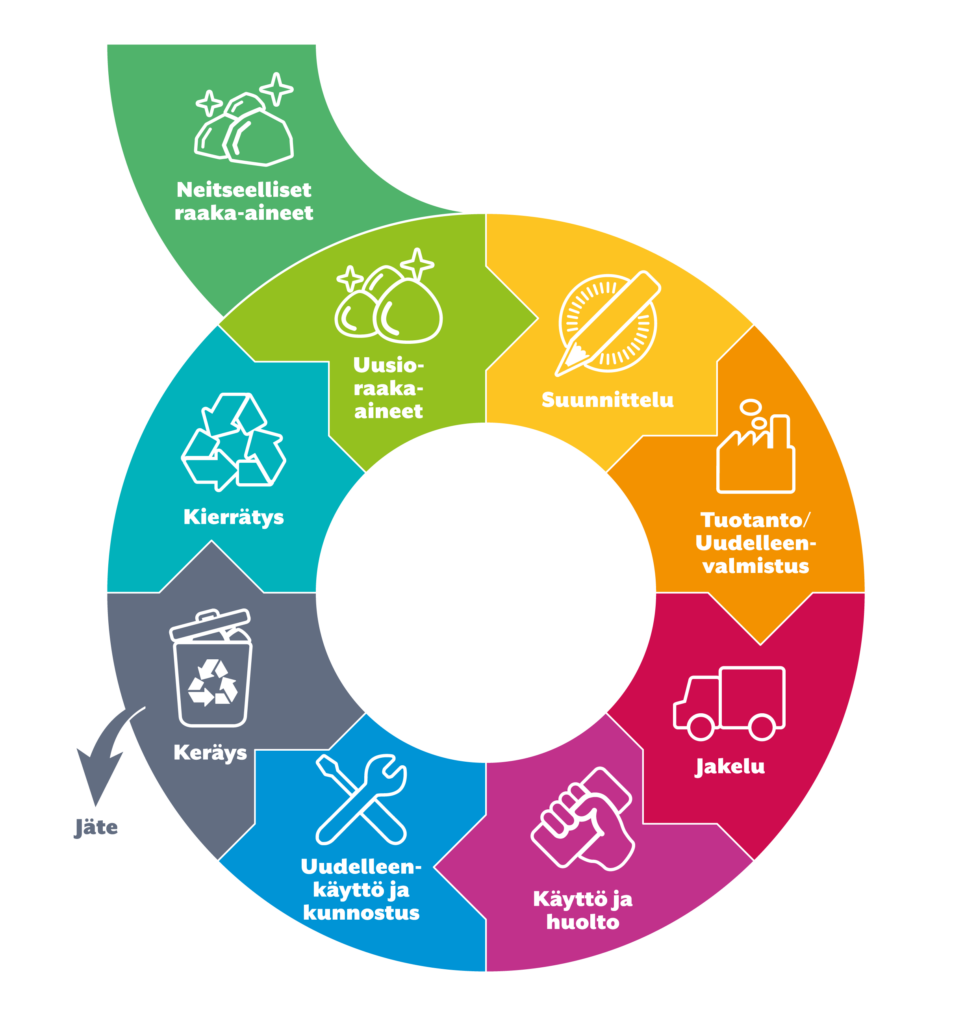 Kuva 3. Kiertotaloudessa tärkein muutos tapahtuu tuotteiden suunnittelussa, jotta irtaantuminen lineaarisesta mallista olisi mahdollista.