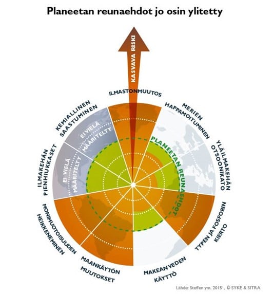 Stockholm Resilience Institute on arvioinut meille planeetan turvalliset rajat, joiden sisällä voimme toimia kestävästi. Olemme ylittäneet nämä rajat monilta osin, esimerkiksi ilmastonmuutoksen, luonnon monimuotoisuuden, maankäytön ja ravinteiden kierron osalta. Meidän on päästävä takaisin turvallisten rajojen sisäpuolelle, jotta ihmiskunnan toiminta voi jatkua.