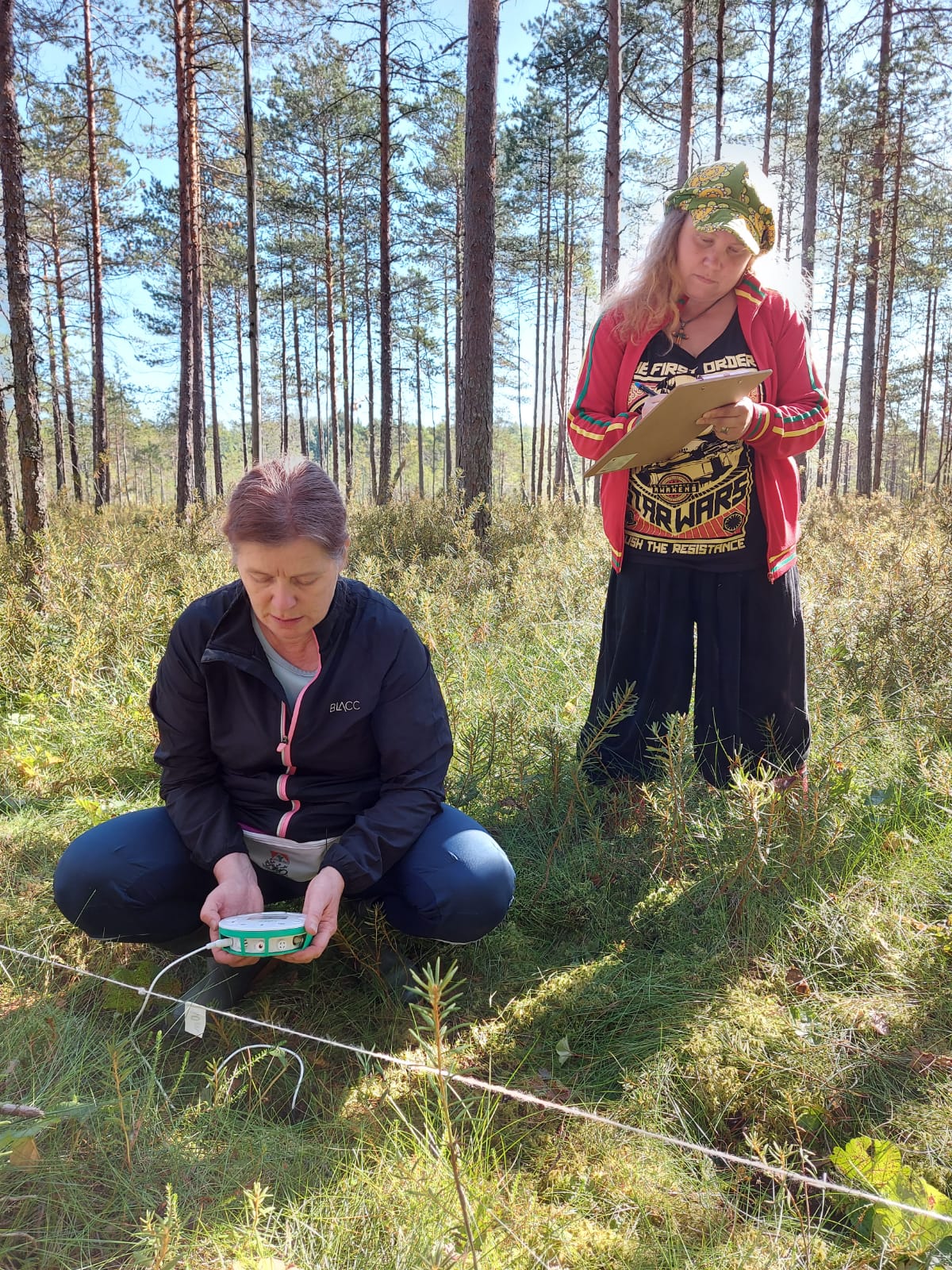 Koulutuksessa ryhdytään ratkomaan metsänväen ja suon haltijoiden välille kehkeytynyttä kuvitteellista rajakiistaa. Tavoitteena on vetää selkeä raja metsän ja suon väliin perustuen puolueettoman tutkijapaneelin tekemiin selvityksiin. Tutkimuspisteitä sijoitetaan maastoon suoralle janalle, viiden metrin välein. Rajaselkkauksen selvittelyssä apuna käytetään moninaisia apuvälineitä: turpeen paksuutta arvioidaan mittariksi tuunatun suksisauvan avulla, puustoisuutta naruharpin avulla (3 m narun pätkä) sekä kasvualustan kosteutta aistinvaraisesti kukkalapion ja viivoittimen avulla kaivetusta tutkimuskuopasta. Olemme myös saaneet Tevellalta lainaksi muutaman helppokäyttöisen ja kevyesti maastoon kuljetettavan kenttälaboratorion. Laitteilla voidaan tutkia mm. ilmankosteutta, maaperän lämpötilaa ja happamuuden vaihtelua. Käytössä on myös perinteisiä pH-indikaattoriliuskoja. Erilaiset välineet selvästi innostavat ja motivoivat tutkijoita.