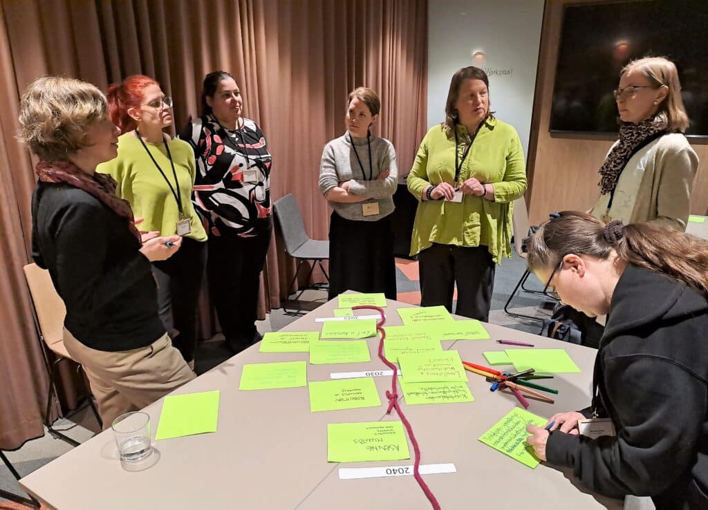 Leijonanosa aamupäivästä käytettiin pienryhmätyöskentelyyn, jossa osallistujat pääsivät visioimaan ja kuvittelemaan ympäristöalan koulutusta vuonna 2050 sekä keskustelemaan konkreettisista etapeista, joita matkalla kohti visiota tarvitaan. Valtaosa ryhmistä oli yksimielisiä siitä, että toivottavassa tulevaisuudessa vuonna 2050 ympäristöteemat ovat integroitu joka alan koulutukseen ja kaikki koulutus tähtää hyvään elämään maapallon rajoissa.