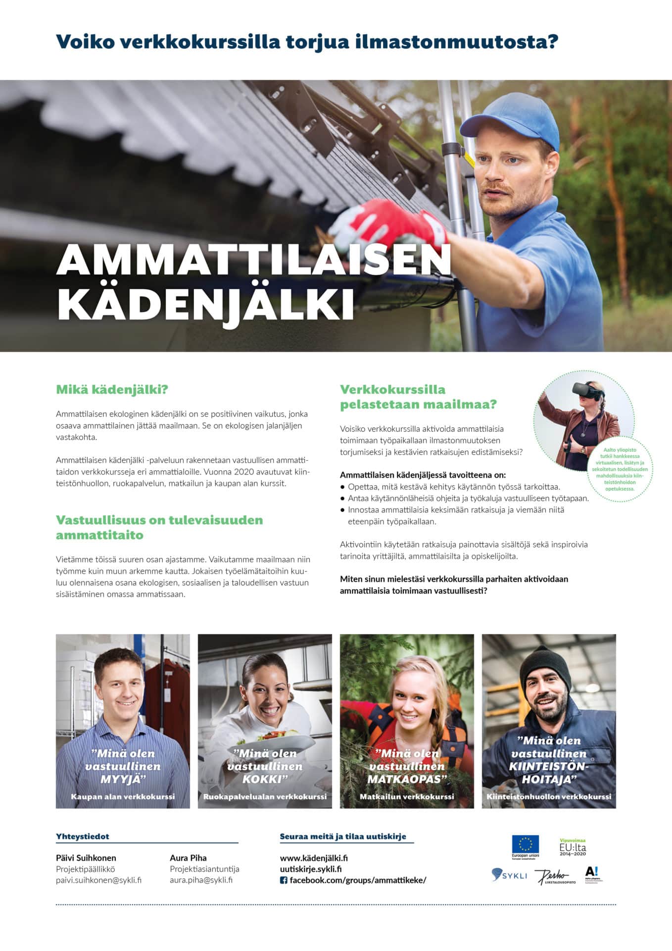 Rakennamme Ammattilaisen kädenjälki -sivustolle vastuullisen ammattitaidon, kestävän kehityksen ja kiertotalouden verkkokursseja eri ammattialoille. Vuonna 2020 avautuvat kiinteistönhoidon, ruokapalvelun, matkailun ja kaupan alan kurssit.